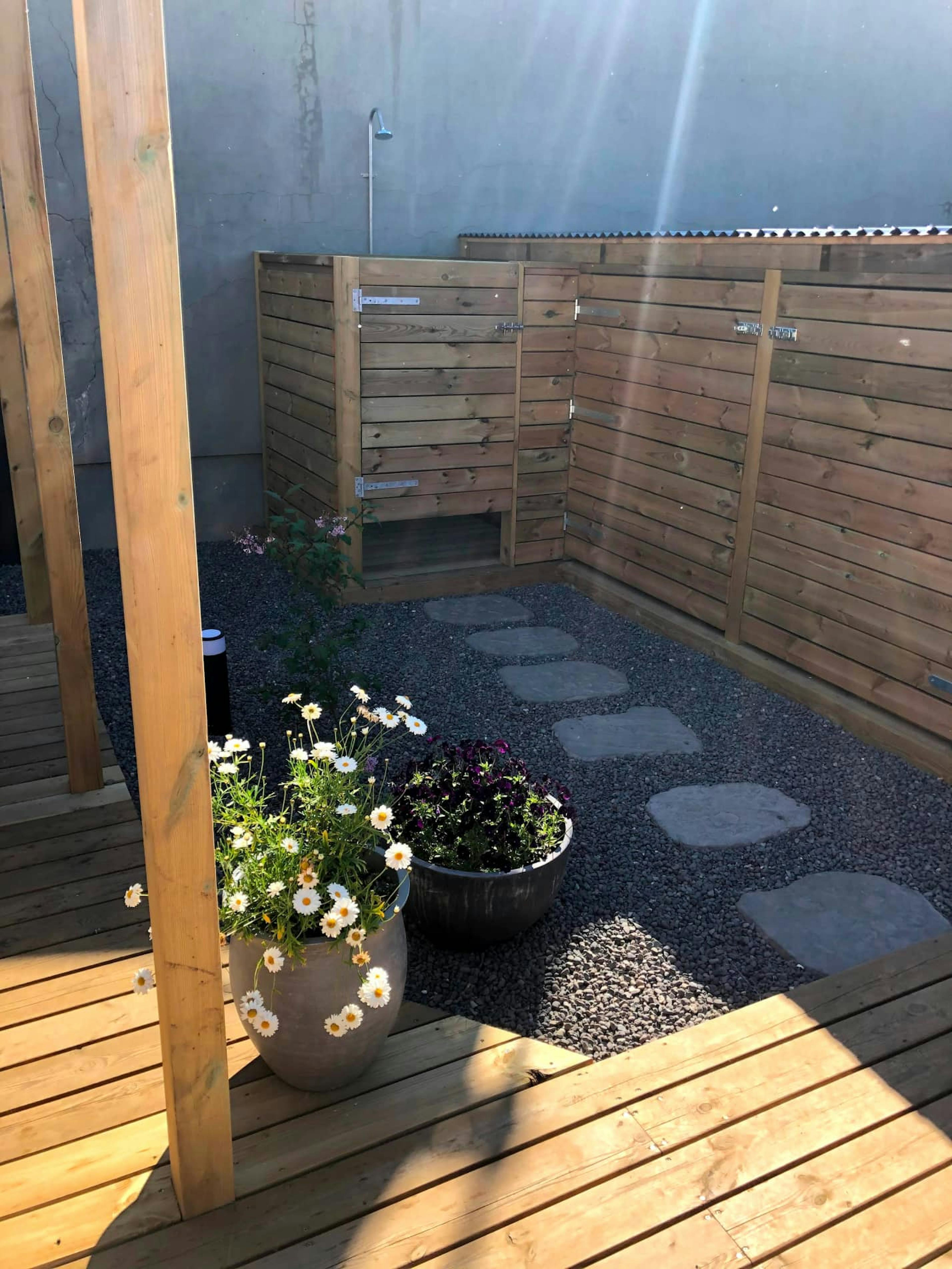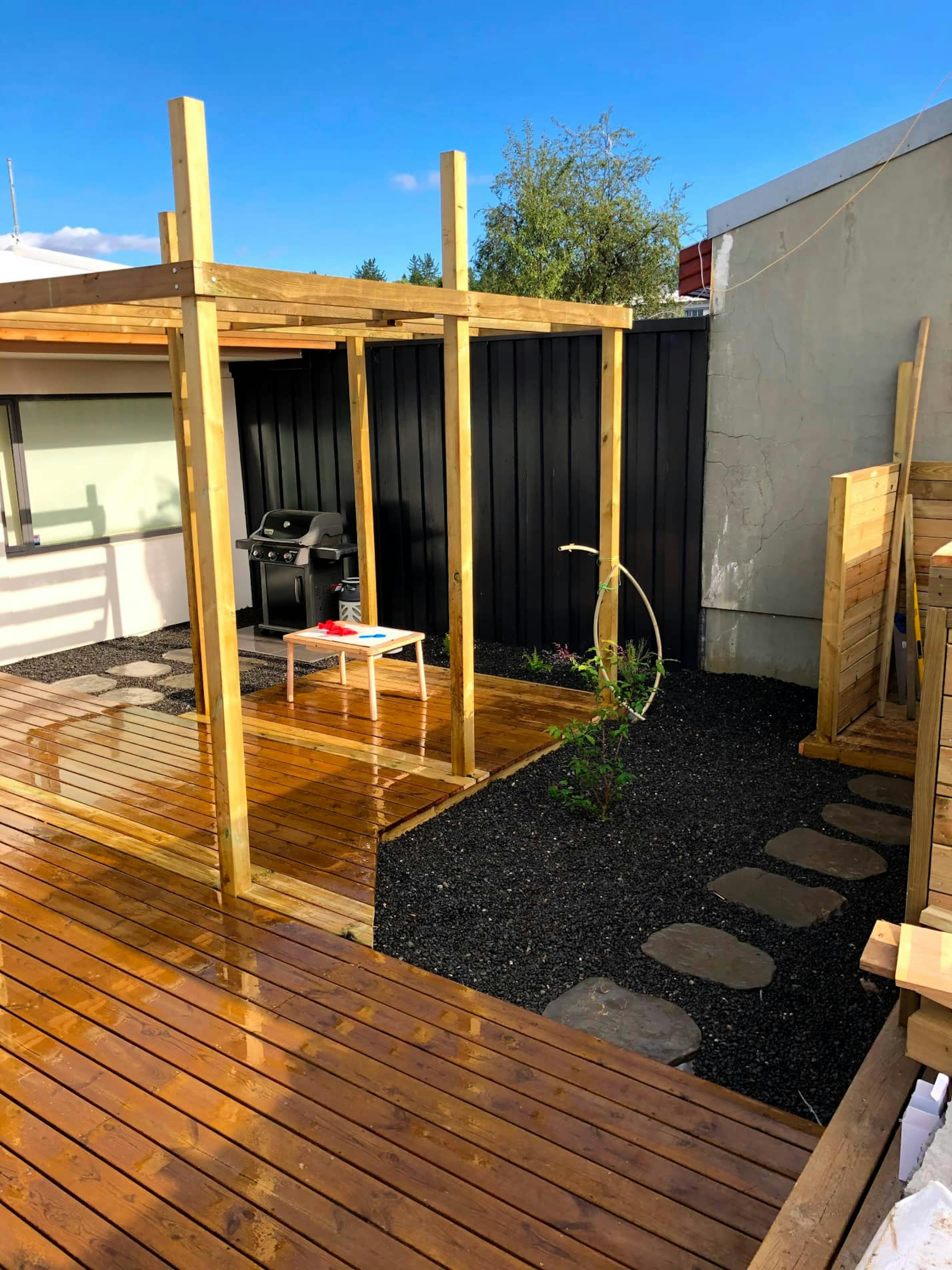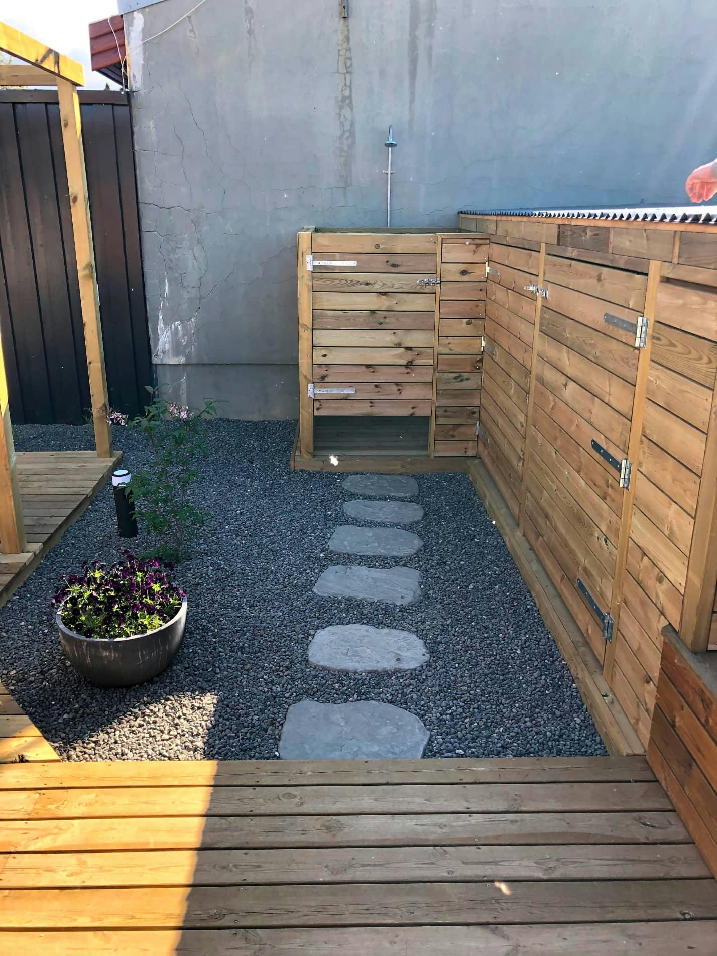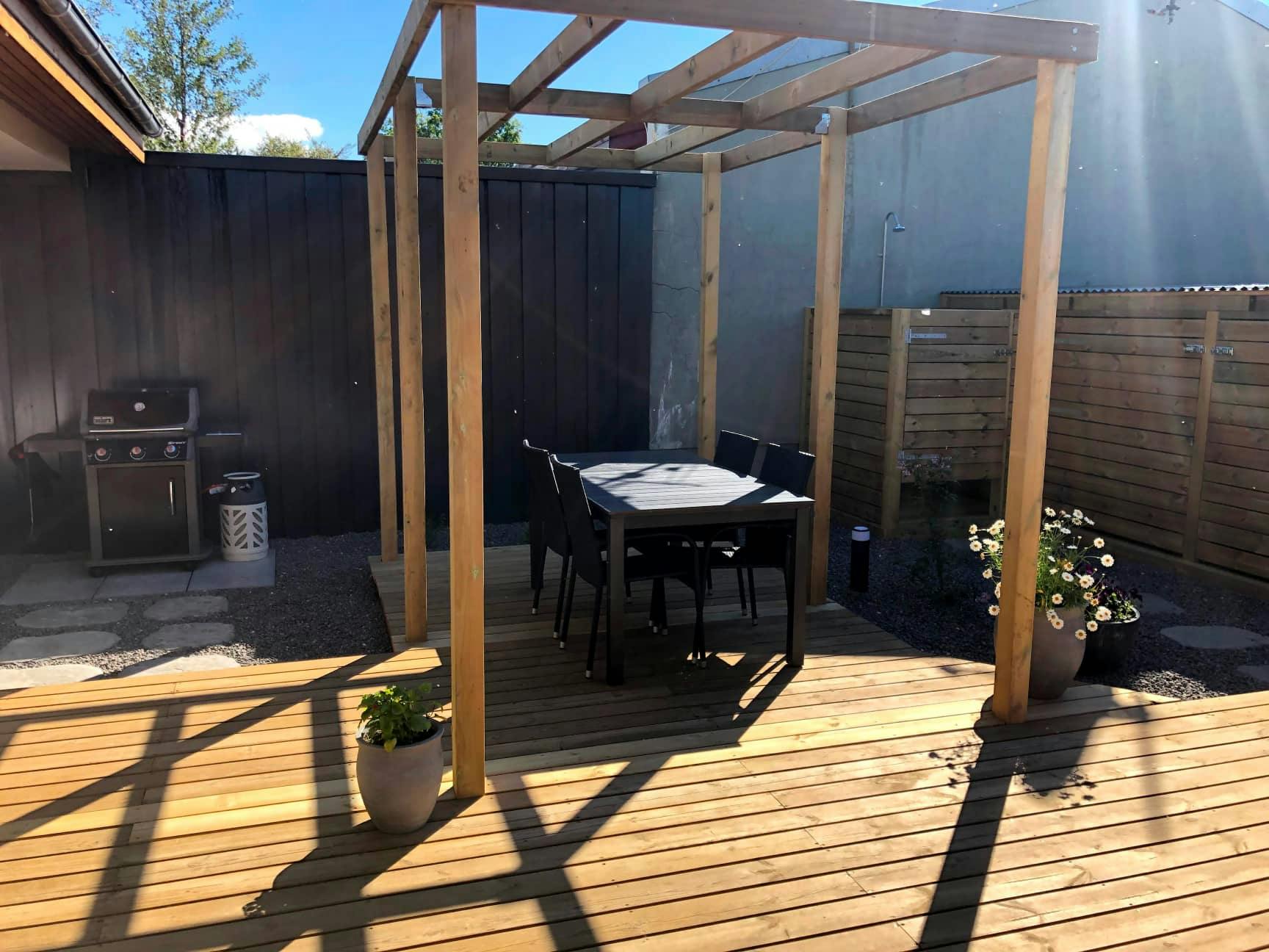 Eigandinn á þessum fallega garði hafði samband við okkur og vildi geymsluskúr, útisturtu, pergolu og góðan stað fyrir grillið.