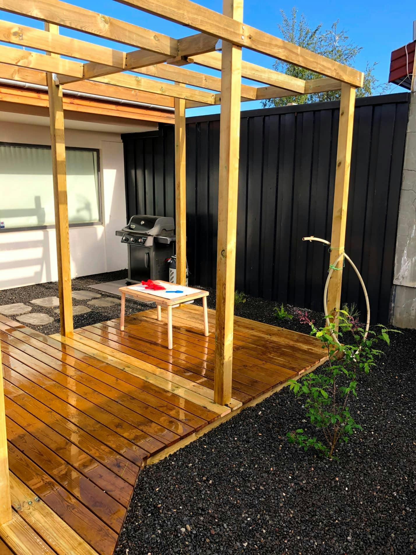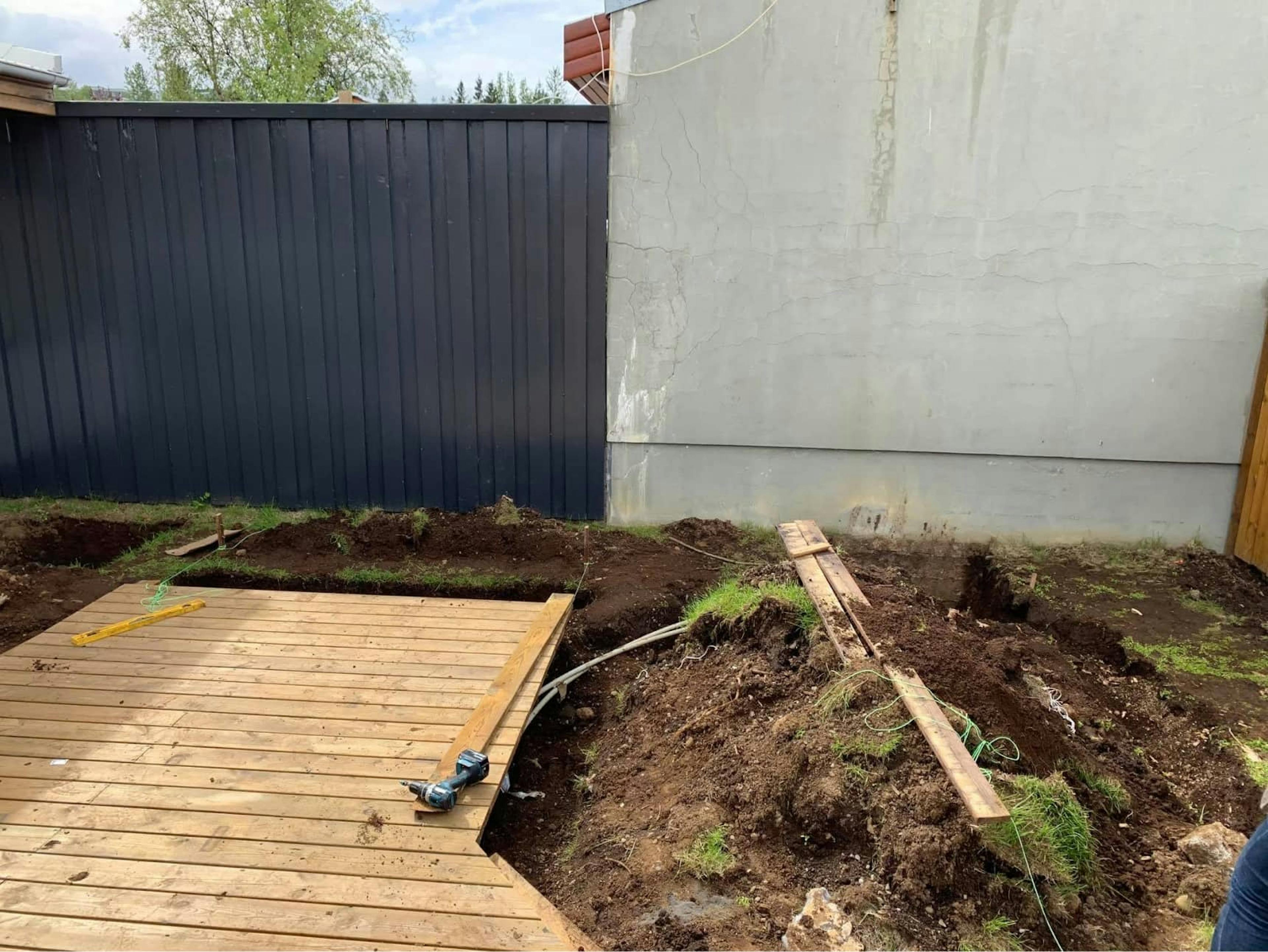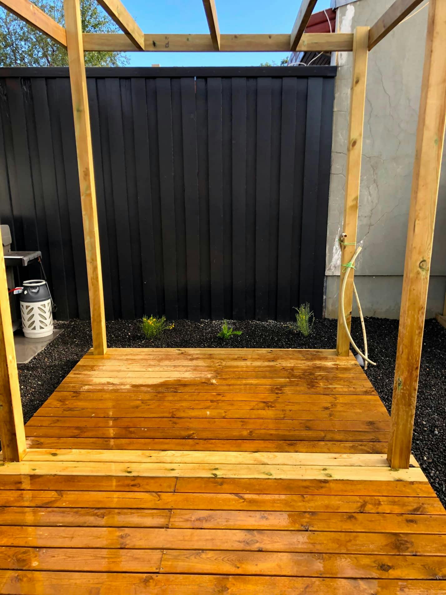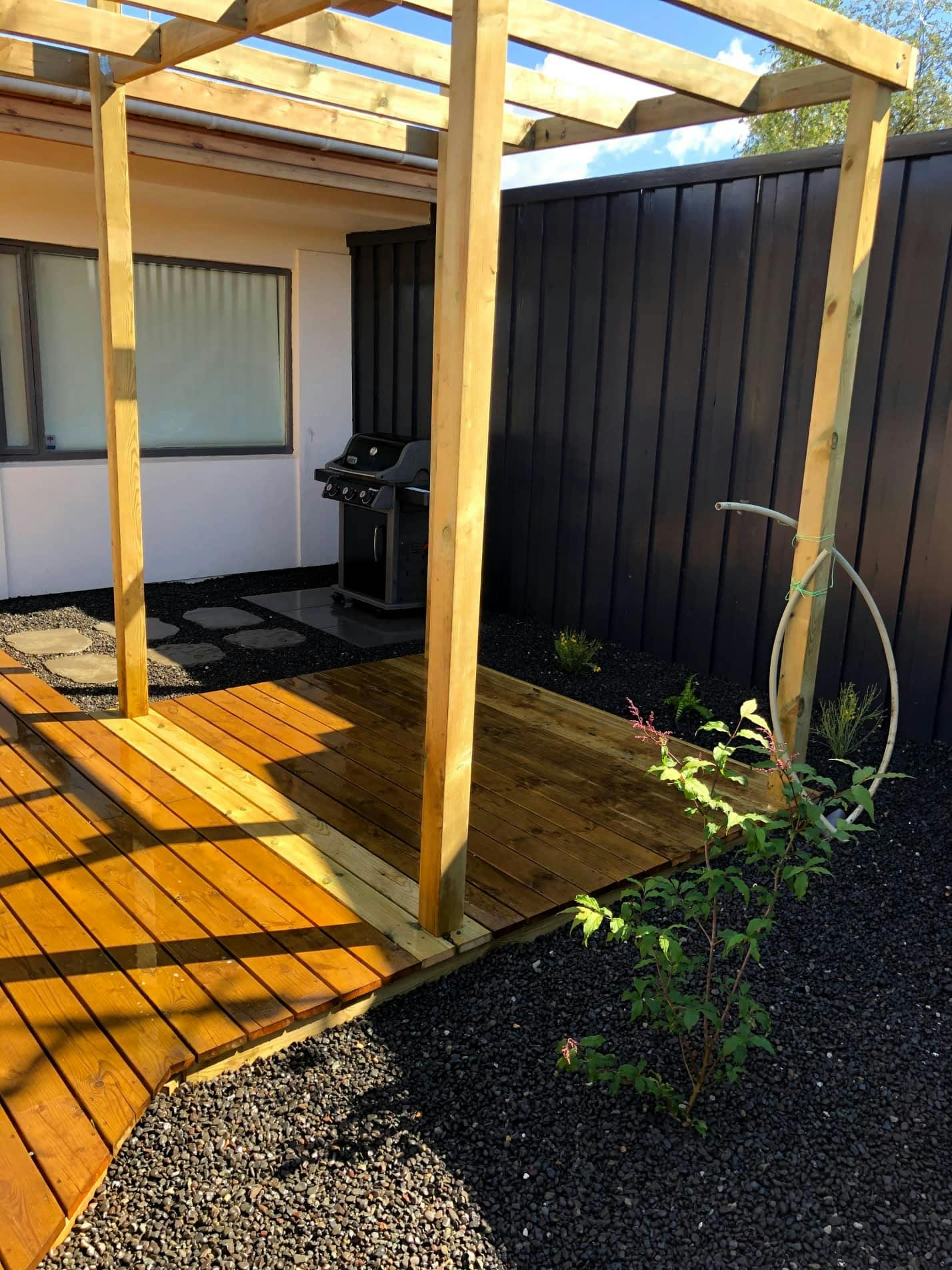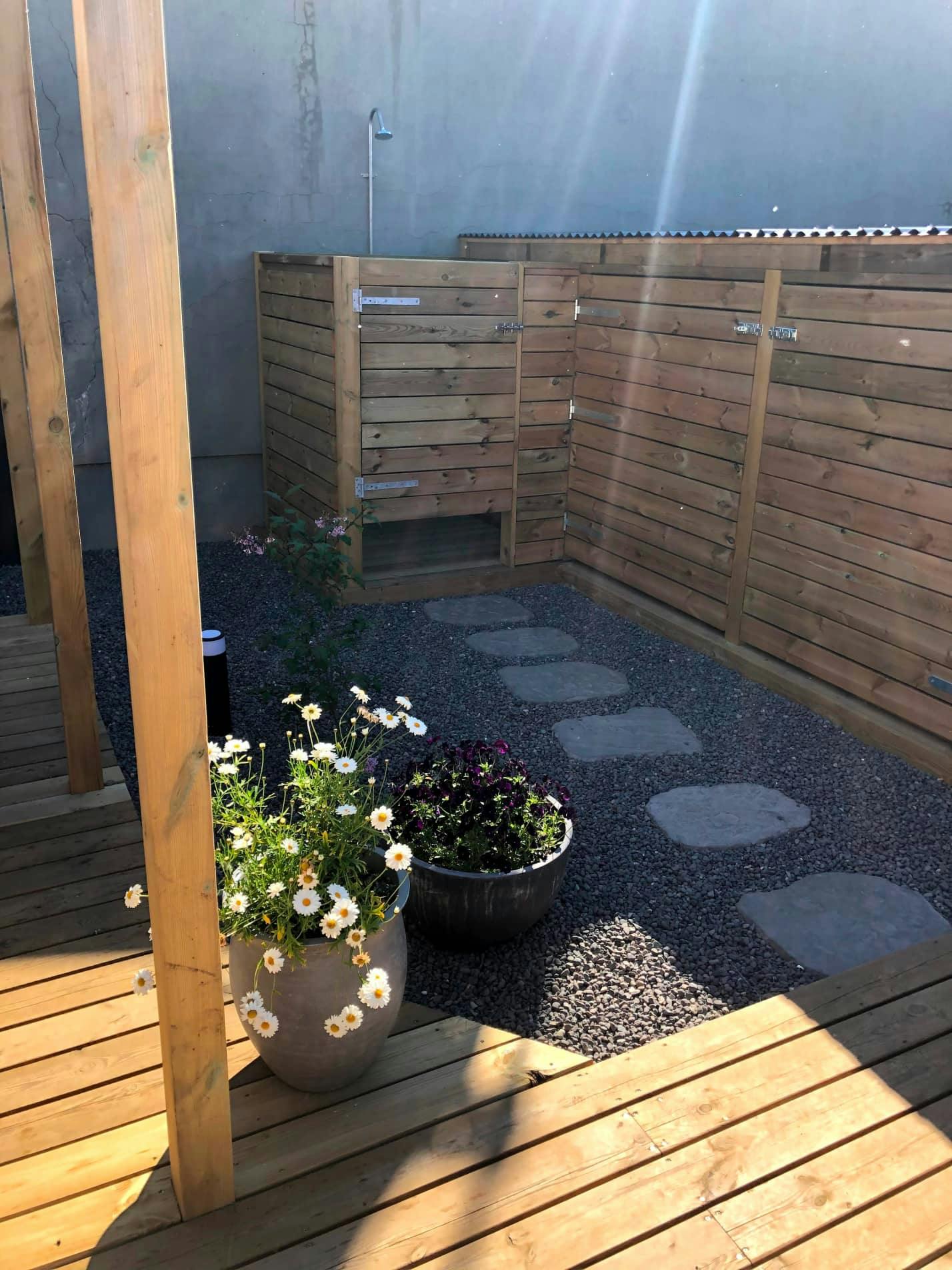 Eigandinn á þessum fallega garði hafði samband við okkur og vildi geymsluskúr, útisturtu, pergolu og góðan stað fyrir grillið.