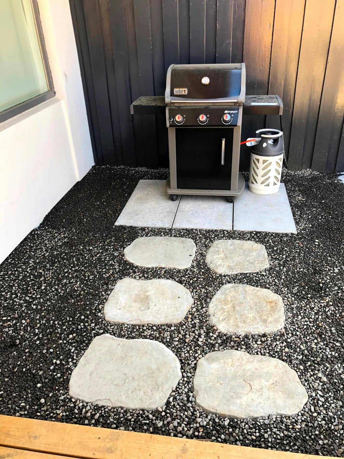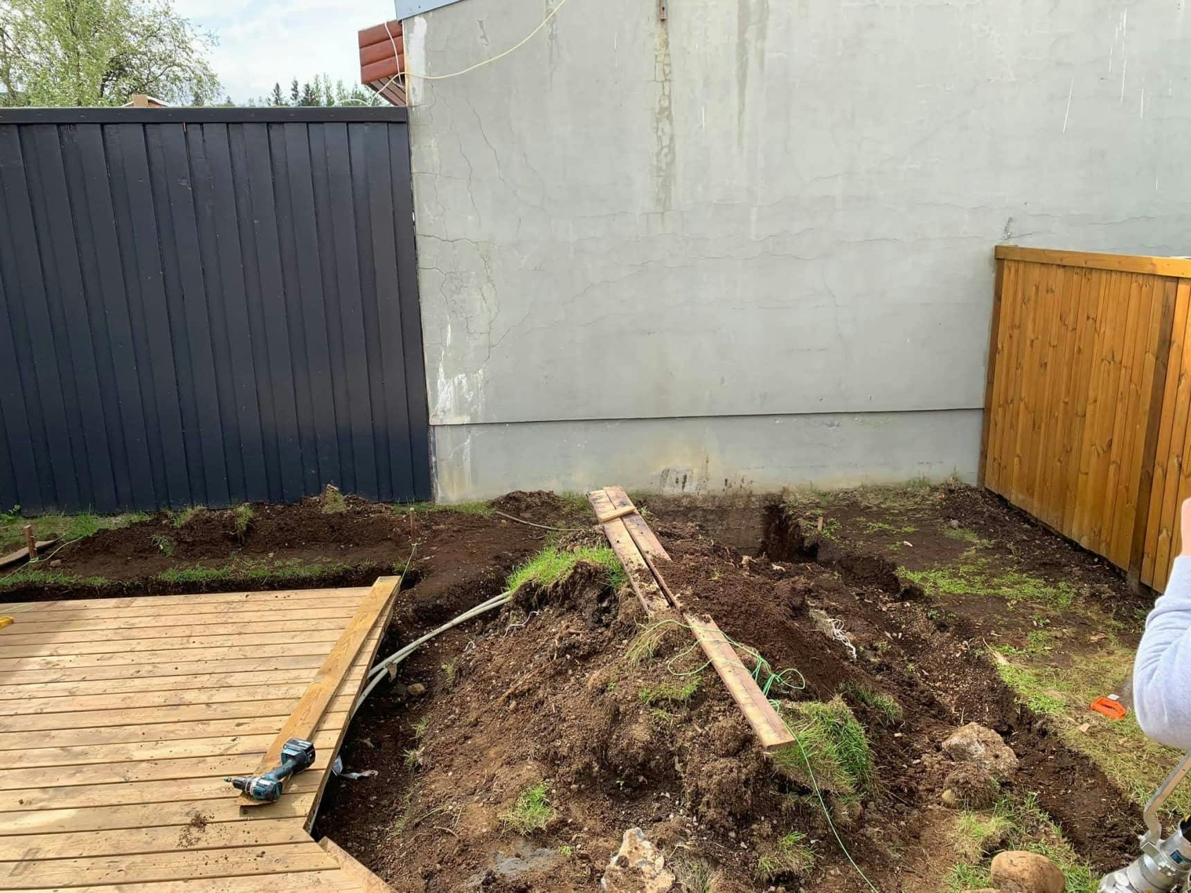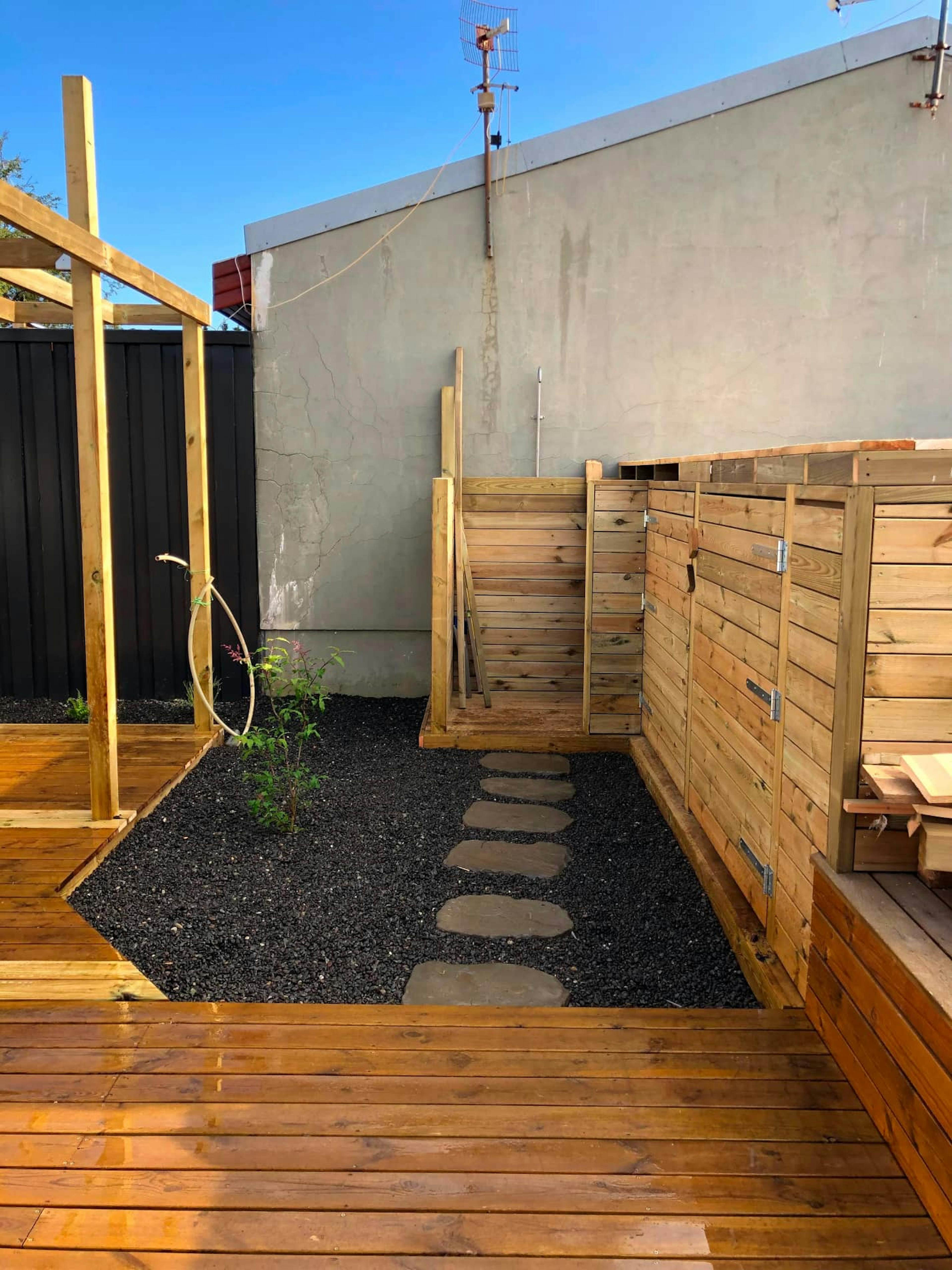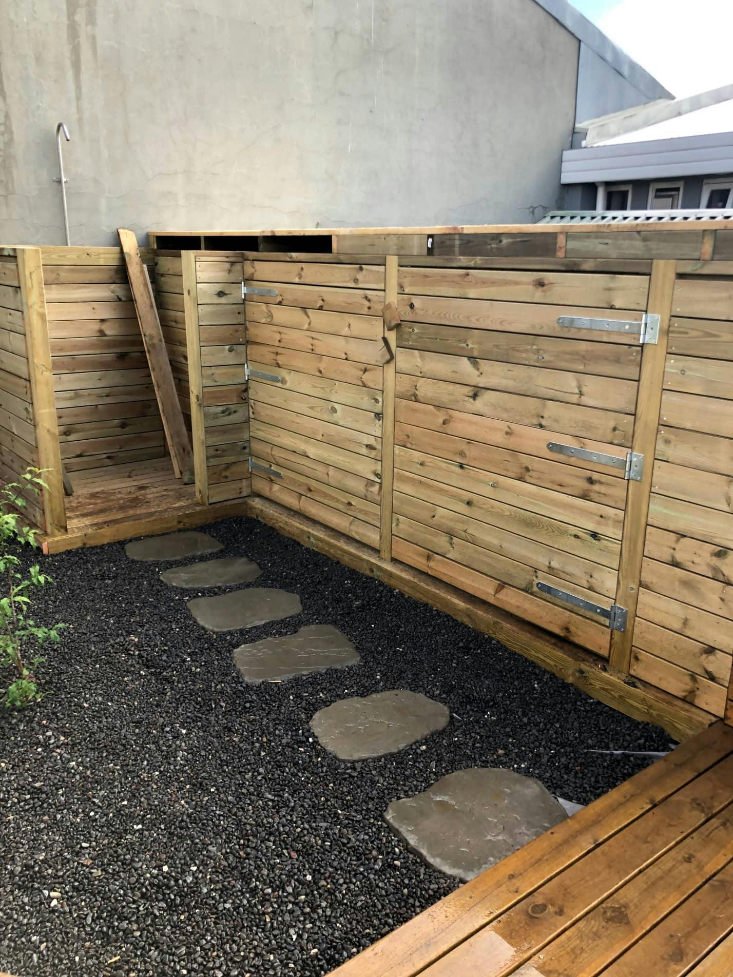 Eigandinn á þessum fallega garði hafði samband við okkur og vildi geymsluskúr, útisturtu, pergolu og góðan stað fyrir grillið.