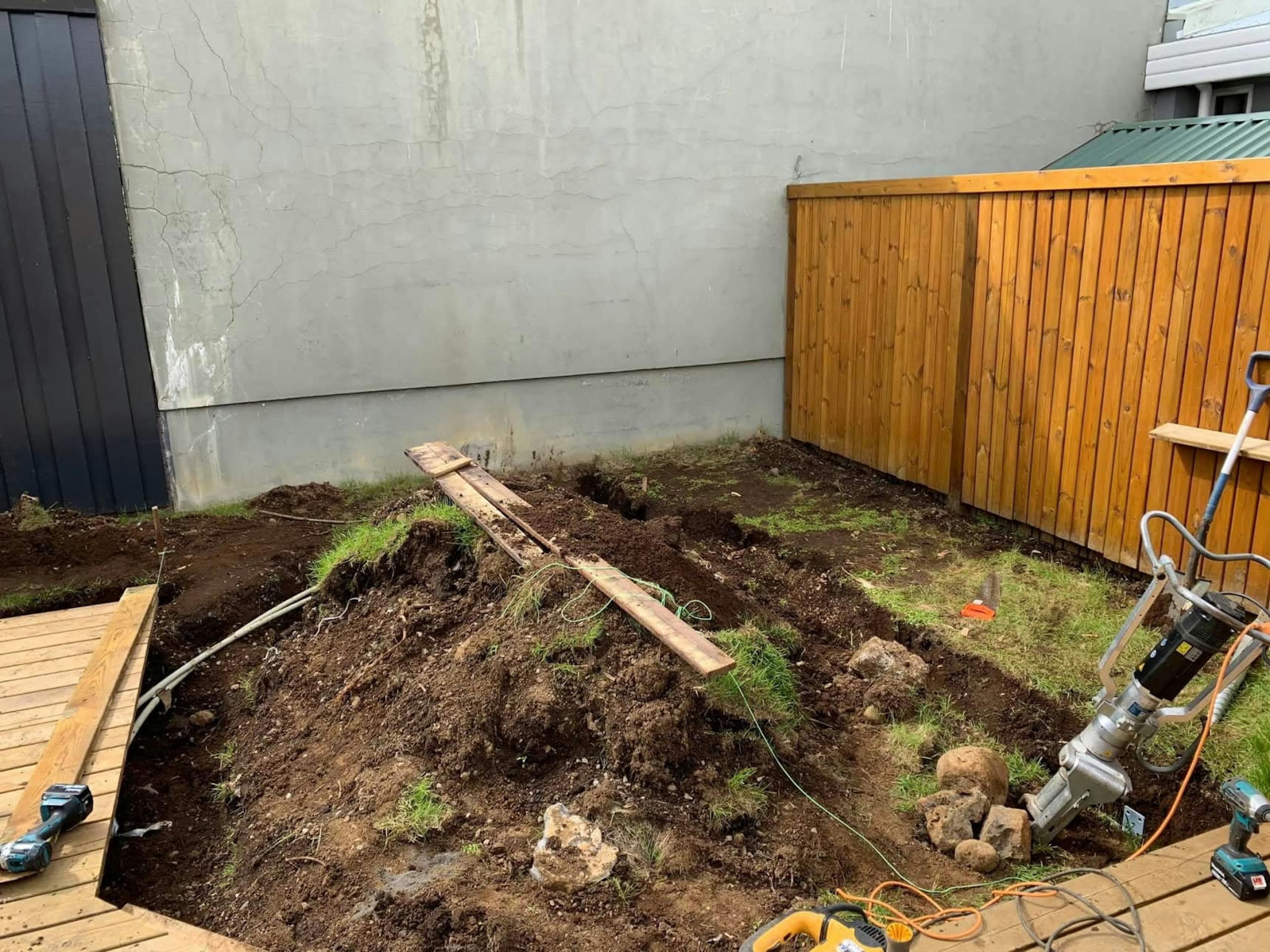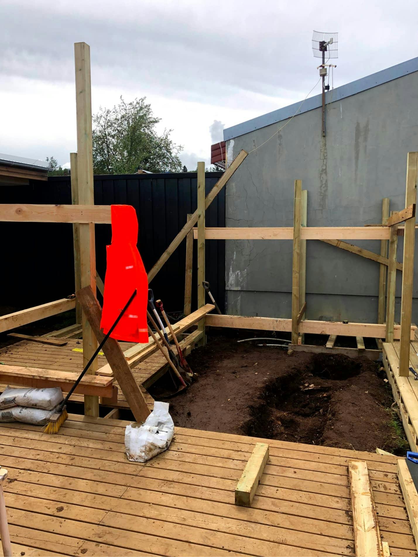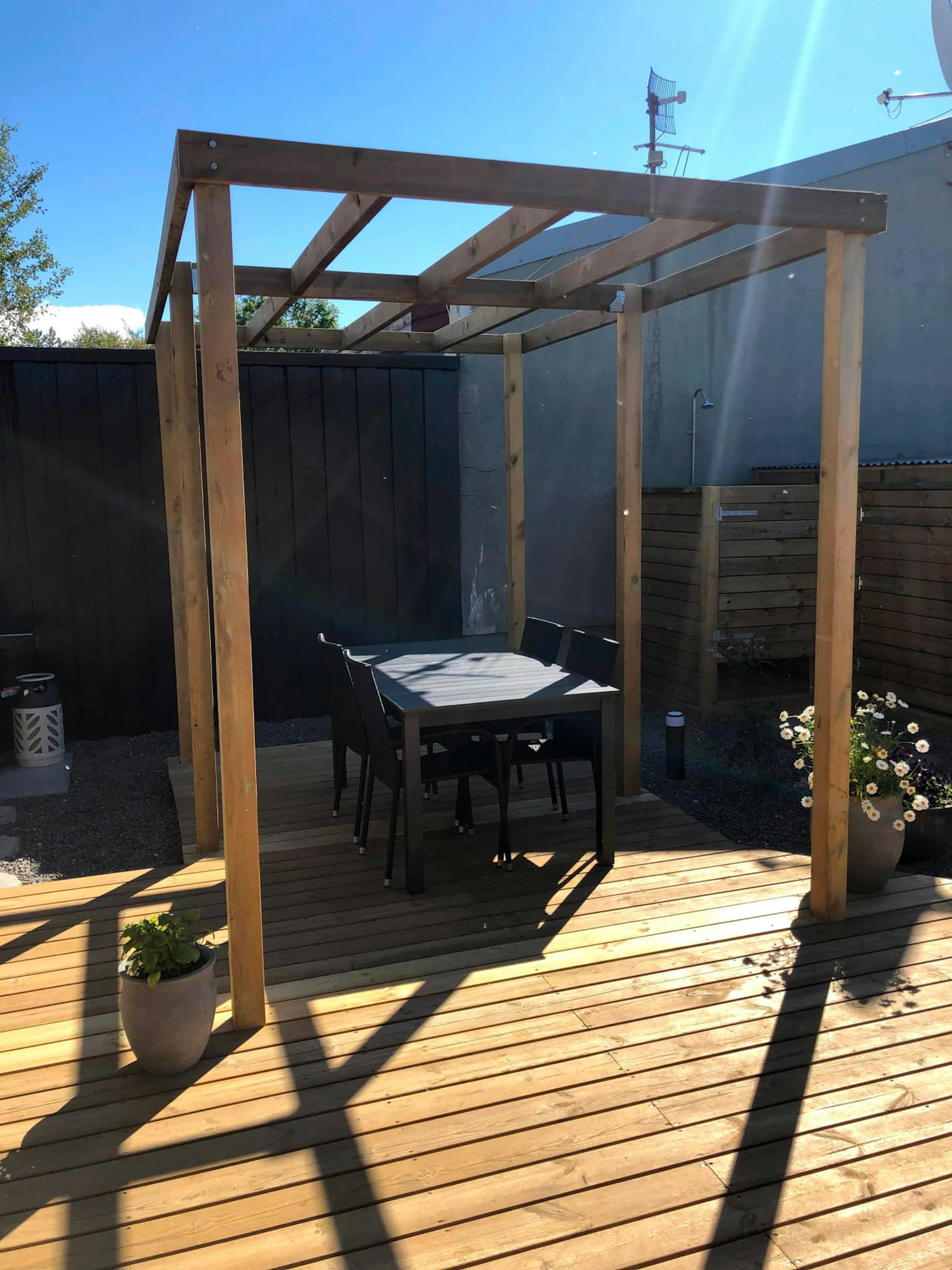 Við stækkuðum pallinn örlítið svo hægt væri að koma góðu borði fyrir. Núna má halda góða grillveislu og bjóða svo öllum í pottinn og sturtu.